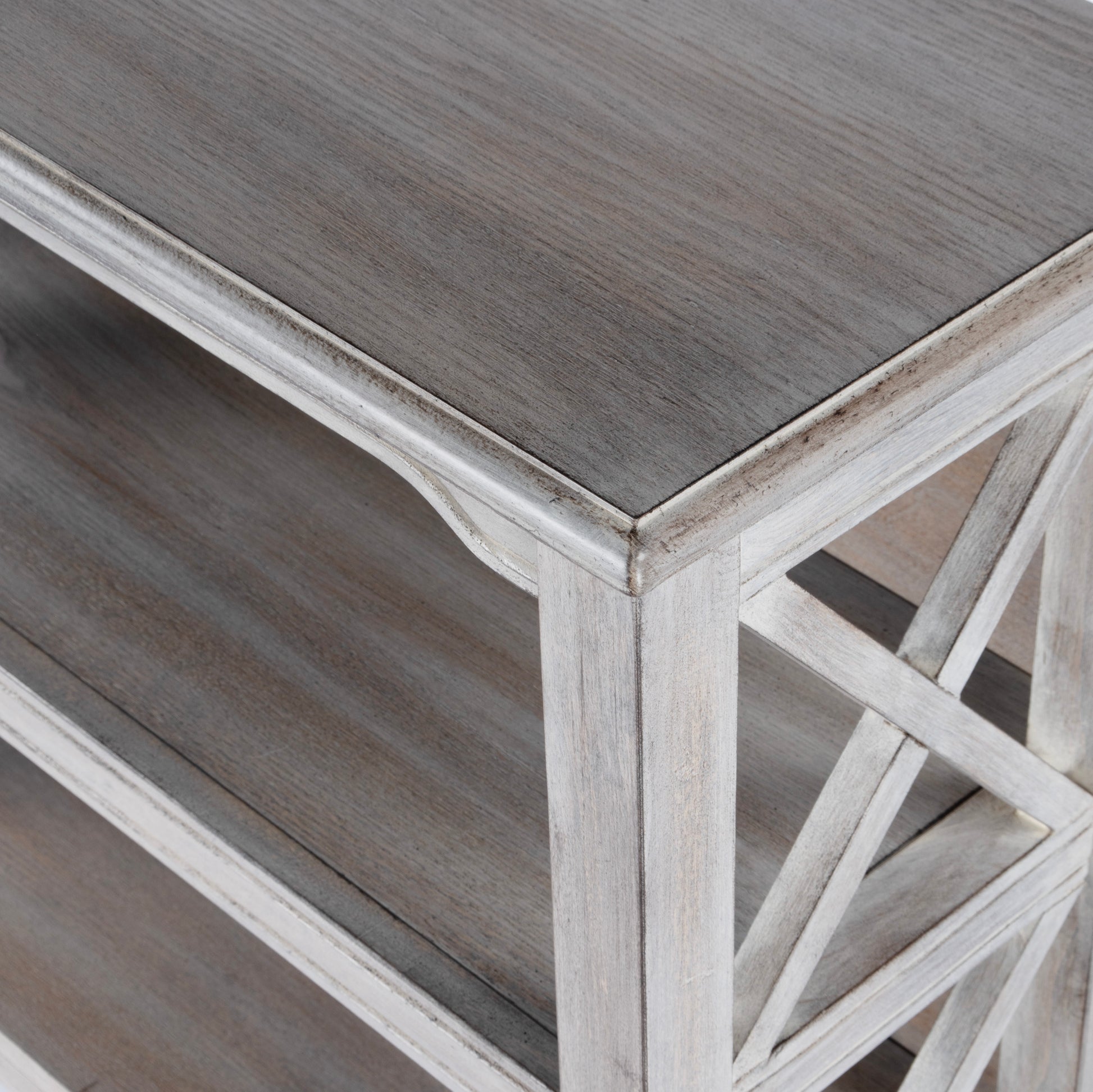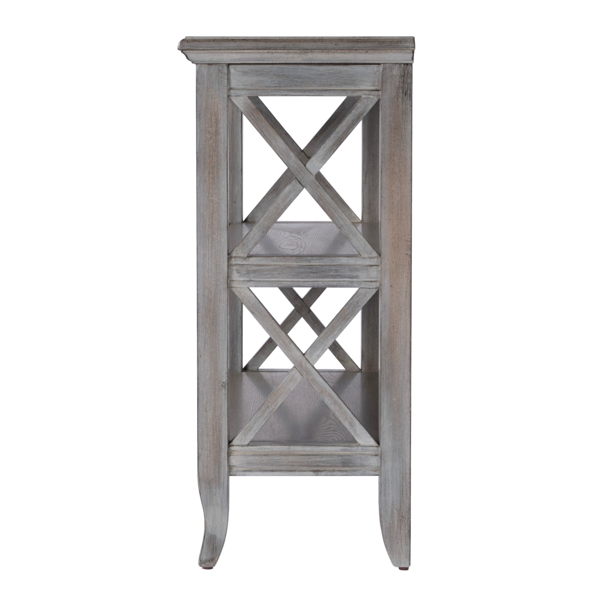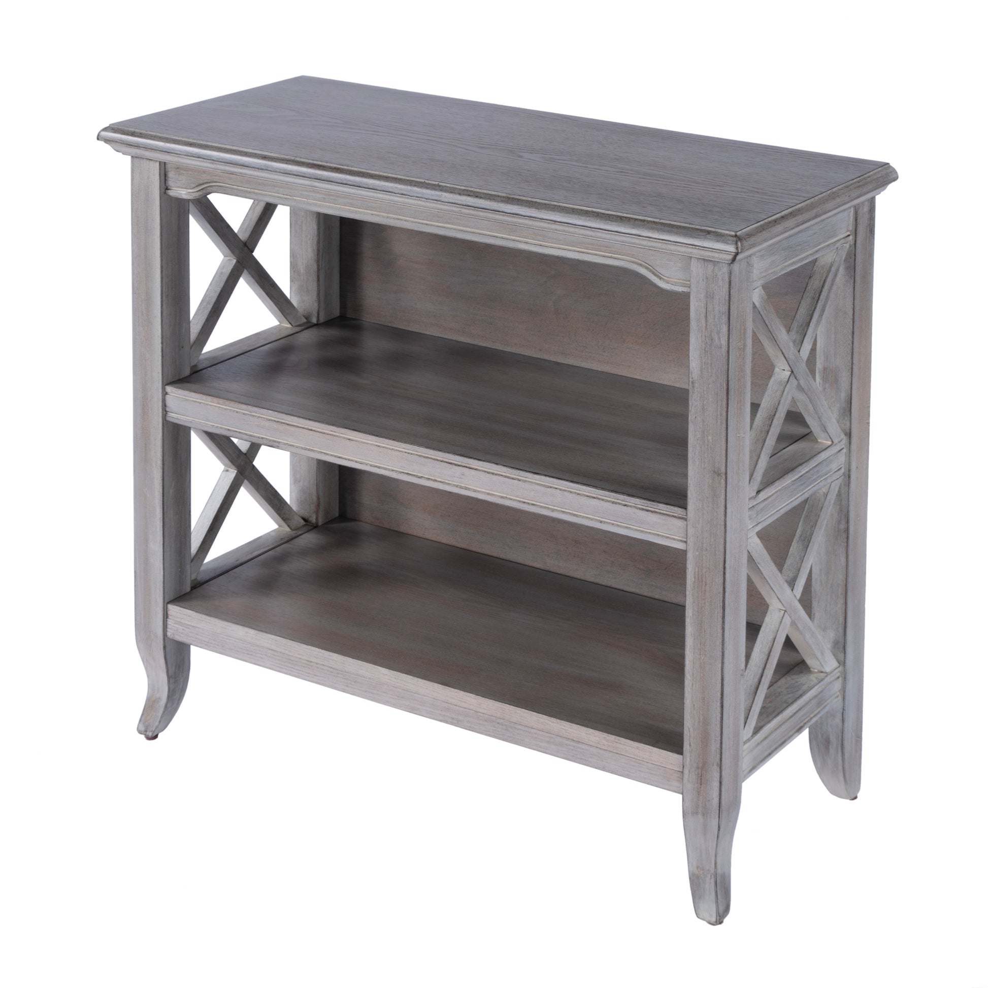 This stylish bookcase is a wonderful accent in a living room, family room, hallway or home office. Made for smaller spaces, versatility is one of its key attributes. Crafted from select hardWood solids and Wood products, it features X-shaped side supports and a distressed driftWood finish. The top and fixed shelves are made from choice birch veneer. Shelf dimensions: Middle- 26 ½â€W, 11â€D, 9?â€H (to top); Lower- 26 ½â€W, 11â€D, 9?â€H (to middle shelf) Dimensions: 32"W x 13"D x 30.25"H
