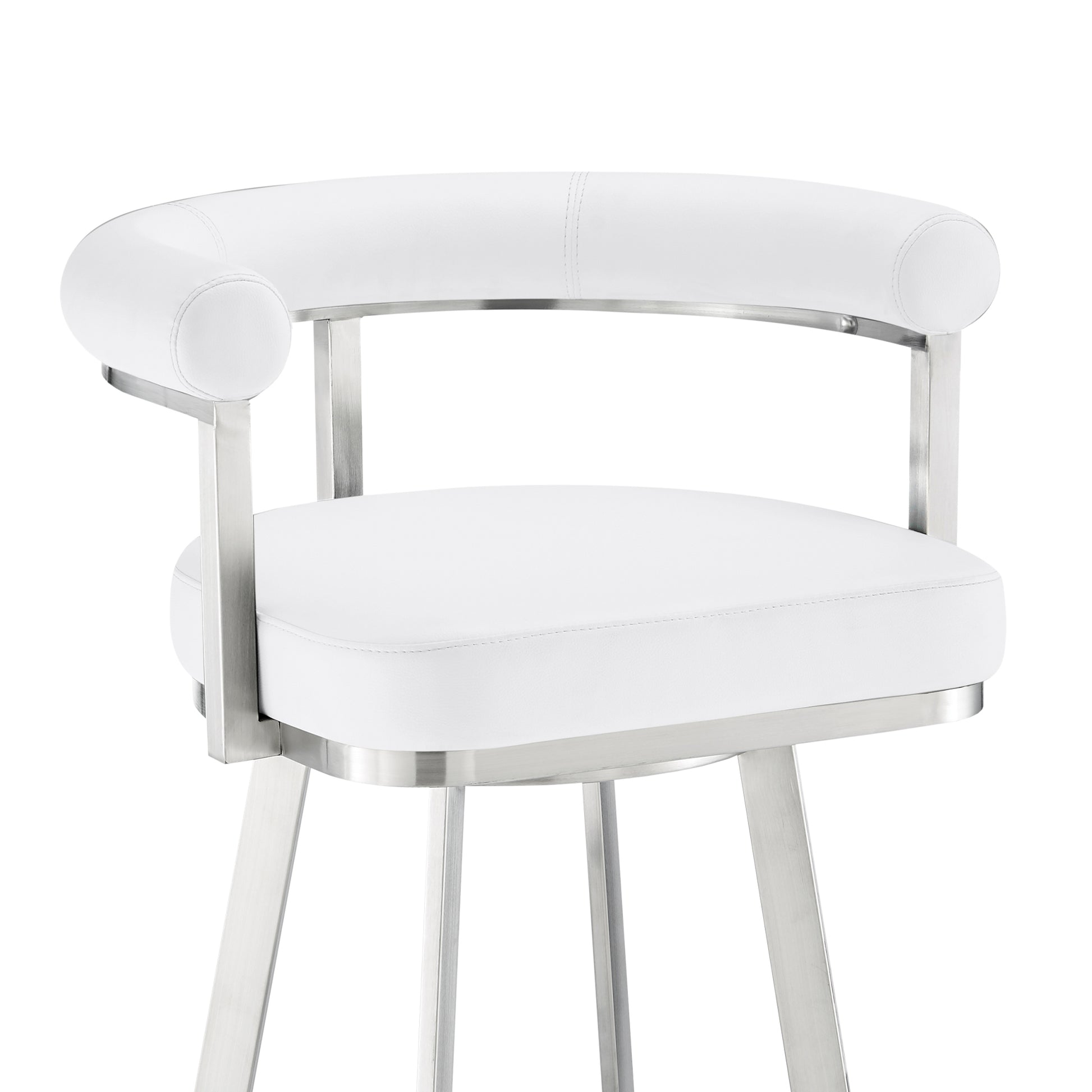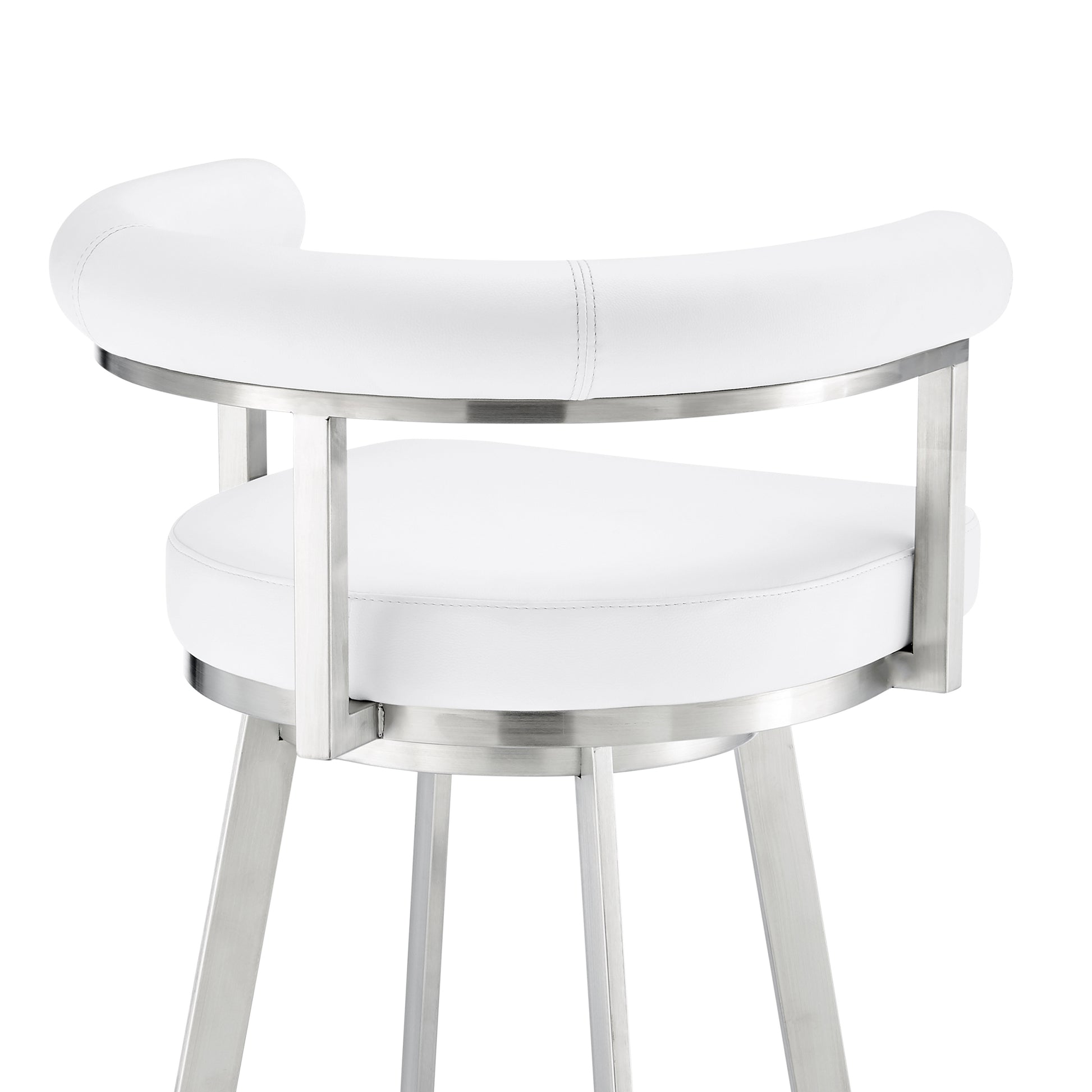 Glam up your space with the flair of our stylish swivel bar and counter stools, expertly crafted from faux leather and metal by Armen Living. Featuring a minimal and streamlined barrel back, these mid-century modern stools are designed to enhance any setting with a sleek and inviting look. The plush cushioning at the back, paired with a padded seat, ensures a comfortable experience, while the open back design promotes breathability.