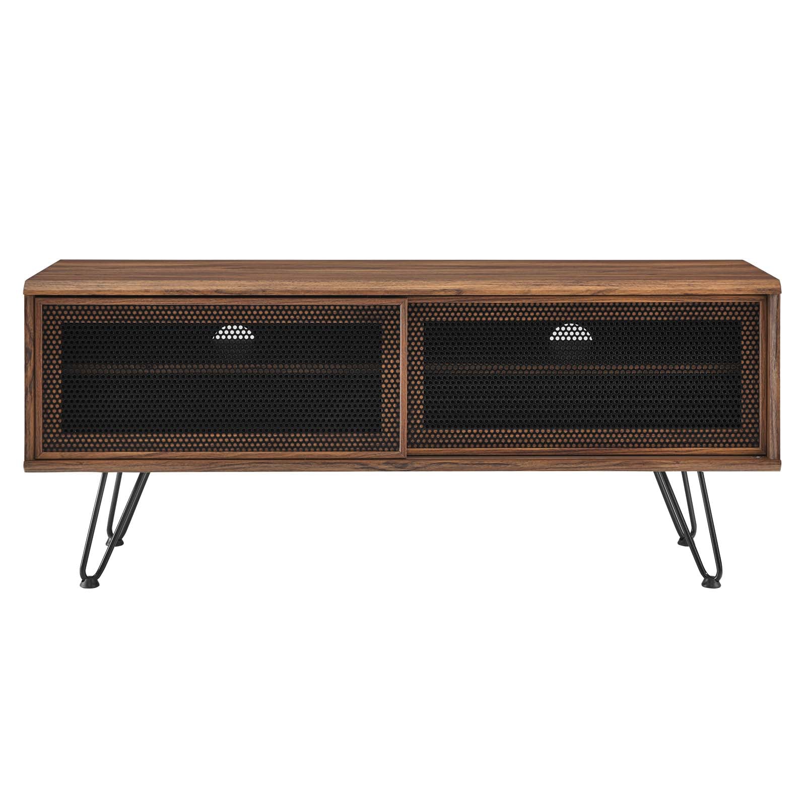 Transform your living space with the modern elegance of this stylish TV stand. Designed to urbanize any room, this entertainment center features two sleek sliding metal mesh doors that blend organic aesthetics with industrial design, making it a perfect addition to your living room, bedroom, home office, or lounge area. Crafted with a sturdy honeycomb core and finished with a wood grain laminate, this media stand not only looks great but is built to last.
