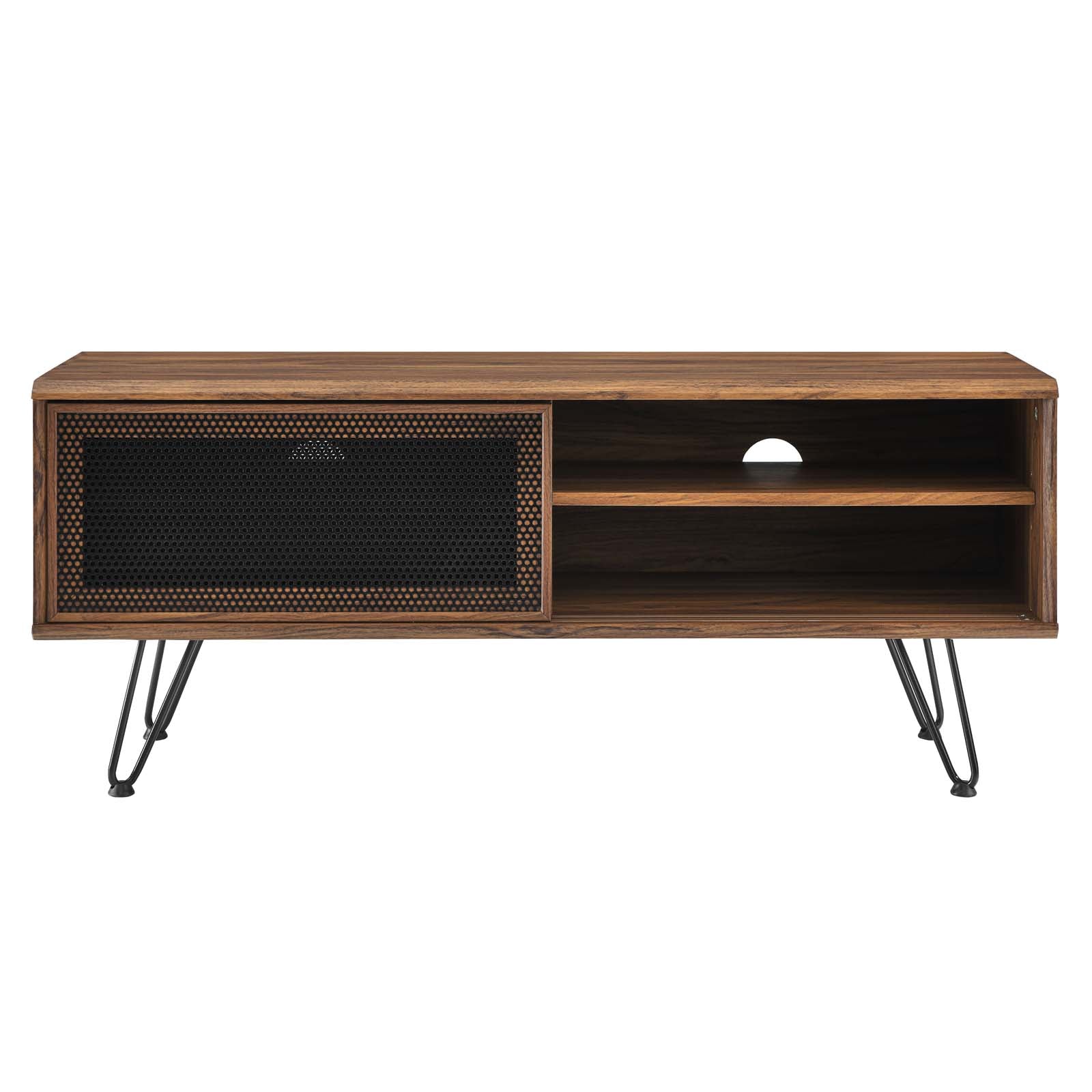 Resting on distinctive splayed hairpin legs equipped with non-marking rubber pads, this TV stand offers both stability and a contemporary flair. With ample storage space, it provides spacious shelving for all your media essentials while cleverly designed cable management holes keep your area looking tidy and allow for optimal ventilation. This versatile piece accommodates TVs up to 52 inches, making it an ideal choice for your entertainment setup.