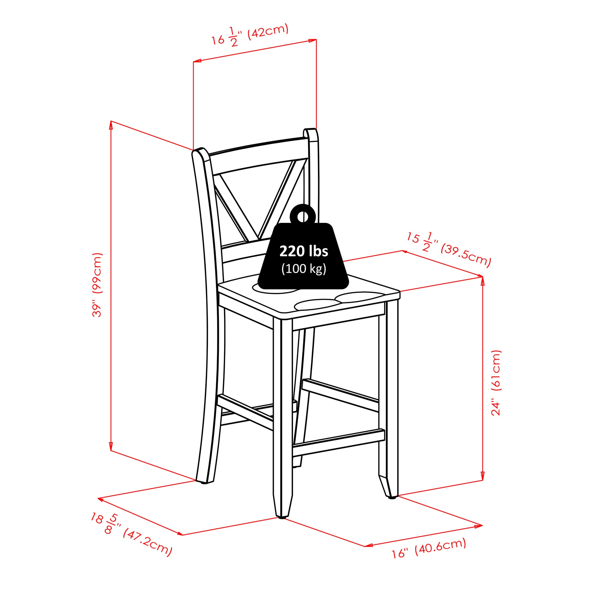 The 3-piece Orlando High Table and V-Back Stool Set combines simplicity and function, reminiscent of a country home antique. The set is a great addition to a dining area, eat-in kitchen, or family room for cards and board games. Or pull up one of the stools and use the table as a desk or workspace. The table features 2 shelves that offer generous storage space for dishes, glassware, and other dining accessories. The solid wood V-Back Stools add a splash of style to the set's warm and homey character. Finished in a rich Walnut, the table is made of solid and composite wood for long-lasting stability. Overall table size is 33.8"W x 33.8"D x 36"H.