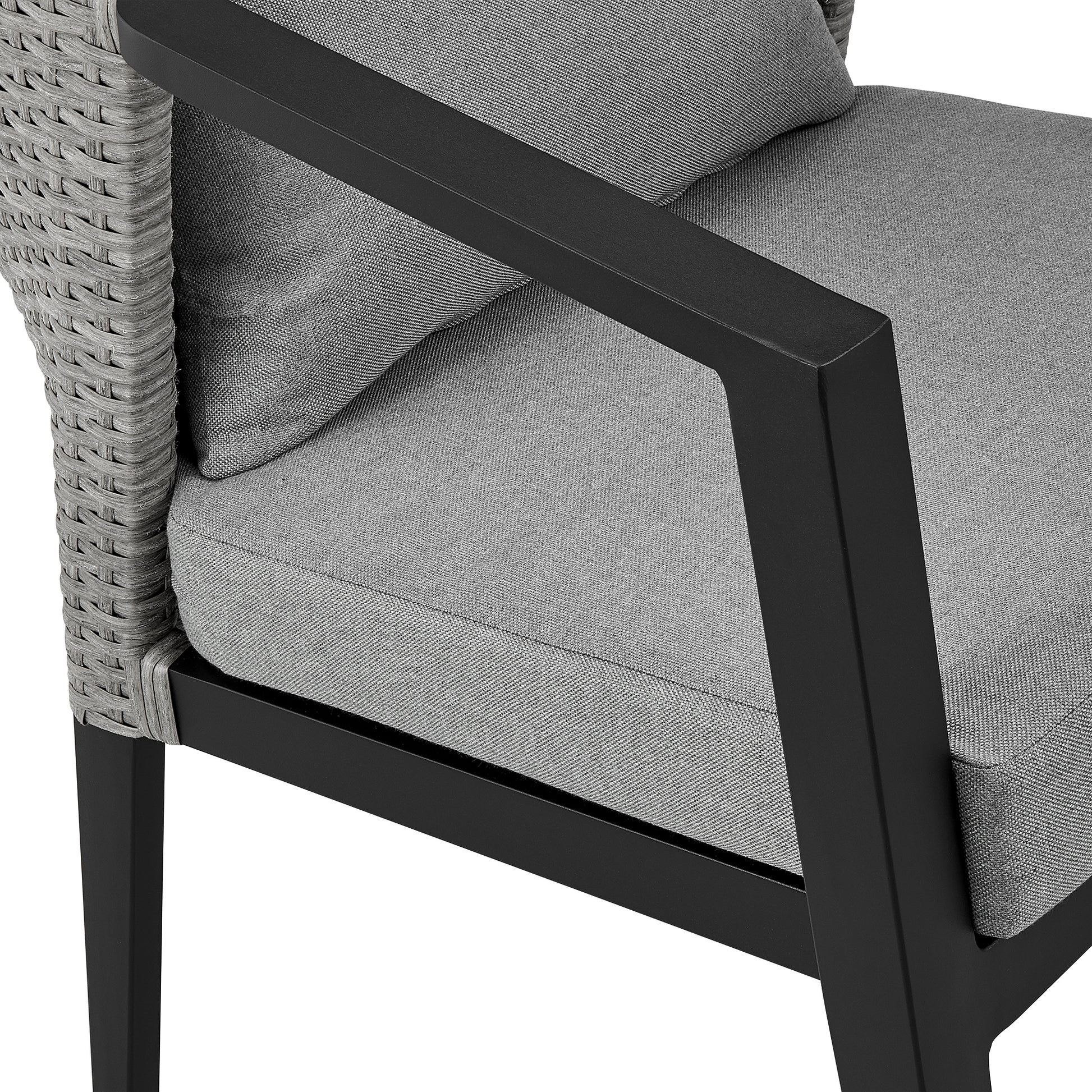 Enhance any outdoor space with the Palma Outdoor 7-Piece Dining Set from Armen Living. This patio set includes 6 dining chairs and 1 rectangular patio dining table. The Palma outdoor chairs with cushions feature a modern, clean line silhouette which is complemented further by the beautiful hand weaved rattan rounded seat back. The cushions of this metal and wicker patio furniture piece are removable and feature a zipper closure, making clean up a breeze! The chic aluminum table and chair frame feature a multi-layer powder coating for effective protection from the weather, everyday wear, and tear. Aluminum is a light material and can be moved from your backyard to your screened-in porch, to your garden with ease, making it the ideal outdoor furniture piece! The slat style tabletop helps elements to easily pass through which adds to its durability, while the umbrella hole adds to the convenience of this outdoor patio furniture piece. This Palma outdoor set is treated to last for many years to come against UV, water, rust, and other outdoor elements. The black finished aluminum frame and table pair beautifully with the gray rattan and dark gray cushions. The Palma dining chairs can support up to 308lbs per seat and have a seat height of 19 inches.