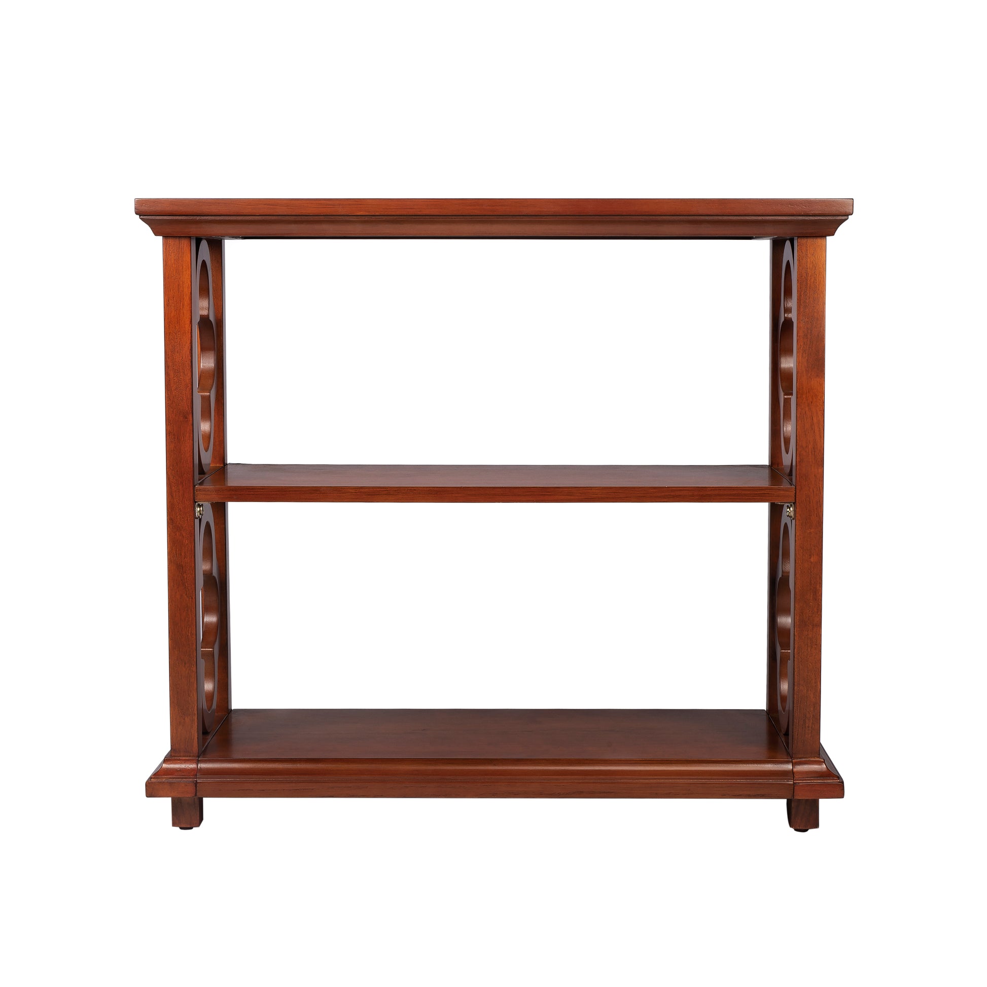 With its open quatrefoil sides, two shelves and open back, this timeless, classic bookcase brings heirloom appeal to the office or living room. Features an striking Olive Ash Burl finish. Dimensions: 30"W x 13"D x 27"H