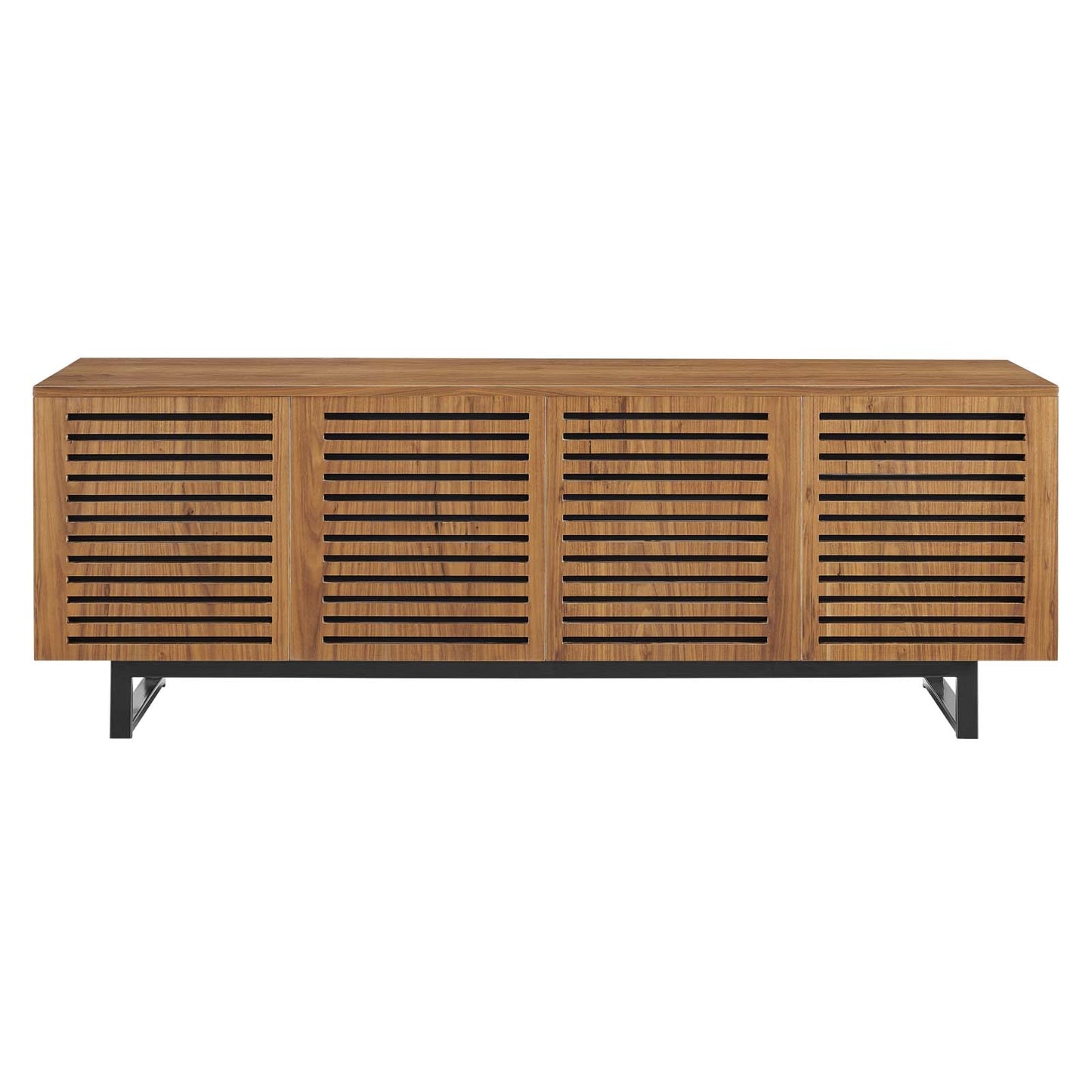Redefine your living space with the Parker TV Stand. Featuring a beautiful design and organic aesthetics, this wooden TV stand brings stylish functionality to the living room, bedroom, and home office and its versatility allows it to double as a credenza, sideboard, buffet, or display stand in the dining room or entryway. Parker is crafted with MDF with walnut wood veneer and rests on powder-coated iron tube legs. Featuring a breezy design for flow-through ventilation, this TV stand is complete with adjustable-height shelves, anti-toppling straps, a cable management hole, and sliding doors that make up the back panel that can also be removed completely. The front doors of this media console feature soft-close hinges. Keep visual space clean with the ample storage space for media essentials with this TV stand that accommodates flat screen TVs up to 75".