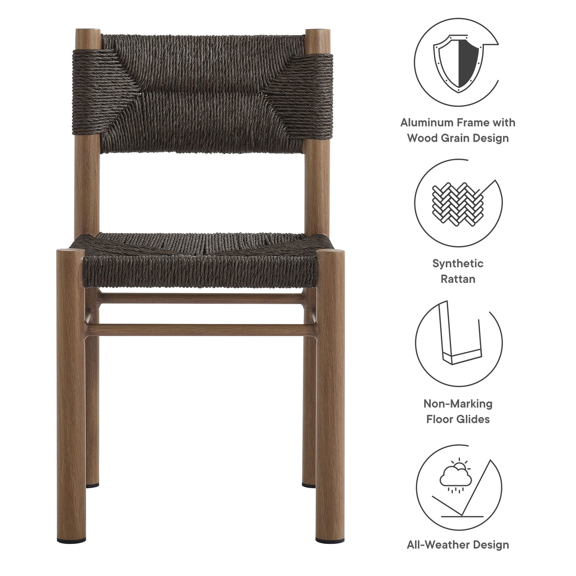 Transform your outdoor space into a stylish retreat with this stunning set of 2 outdoor wicker dining chairs. These rattan patio chairs seamlessly blend elegance and durability, featuring a robust aluminum frame designed with a chic wood grain finish and beautifully woven synthetic rattan for the seat and backrest. The intricate pattern of the rattan adds a touch of sophistication to any outdoor setting, making these woven dining chairs perfect for both casual and formal gatherings.