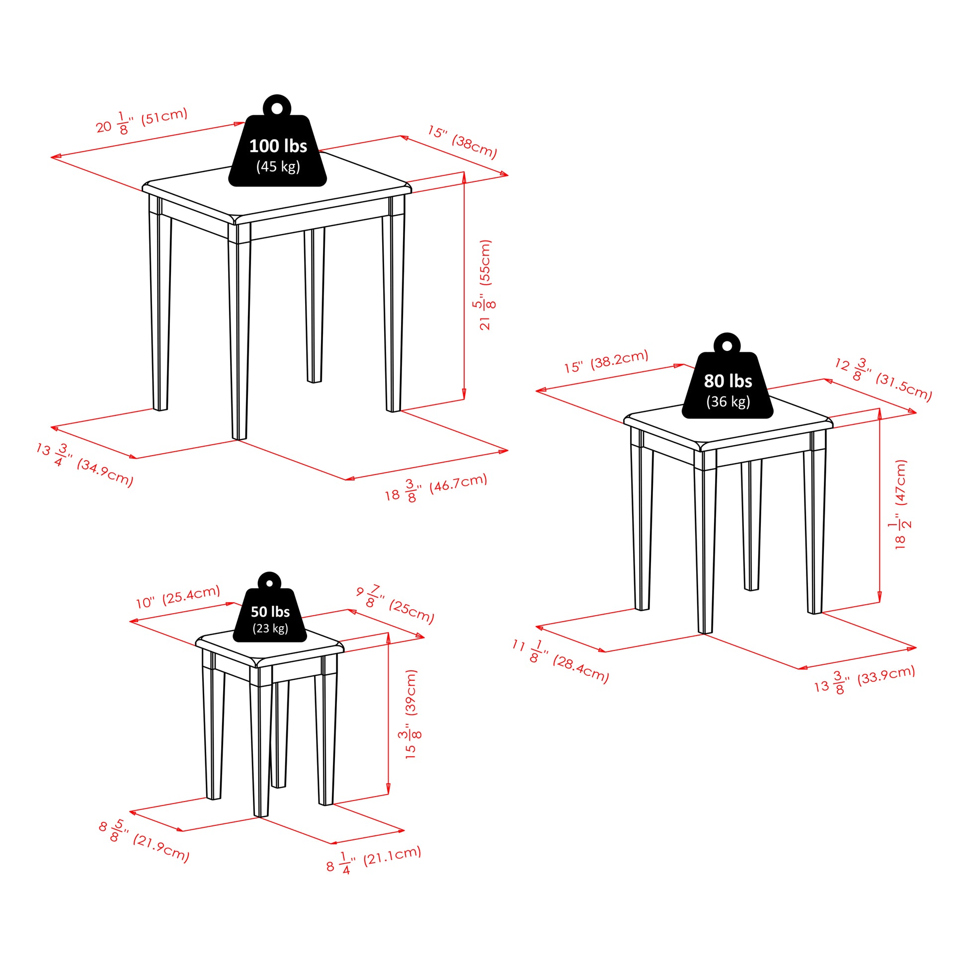 The Winsome Wood Regalia 3-Pc Nesting Tables combine contemporary design with a functional innovative look that will be a great addition to your home. Stack the three nesting tables to keep them together as a set or use individually in the same room or separate them to use in different areas of your home. Its sleek surface is the perfect canvas for displaying an array of framed family photos in the living room or add this set to the den to complement a traditional arrangement. With its open base, this simply-chic set is a charming addition to your furniture collection. No matter what room you choose this set blends effortlessly into any casual aesthetic. Made up of remarkably sturdy solid and composite wood for long lasting durability, in a walnut finish that brings out the warmth of the wood grain. Conveniently ships in 1 box and ready for assembly. Replacement parts can be requested directly to the manufacturer within 60 days from date of purchase.Dimensions : 20.08 in. Wide 14.96 in. Deep 21.65 in. High