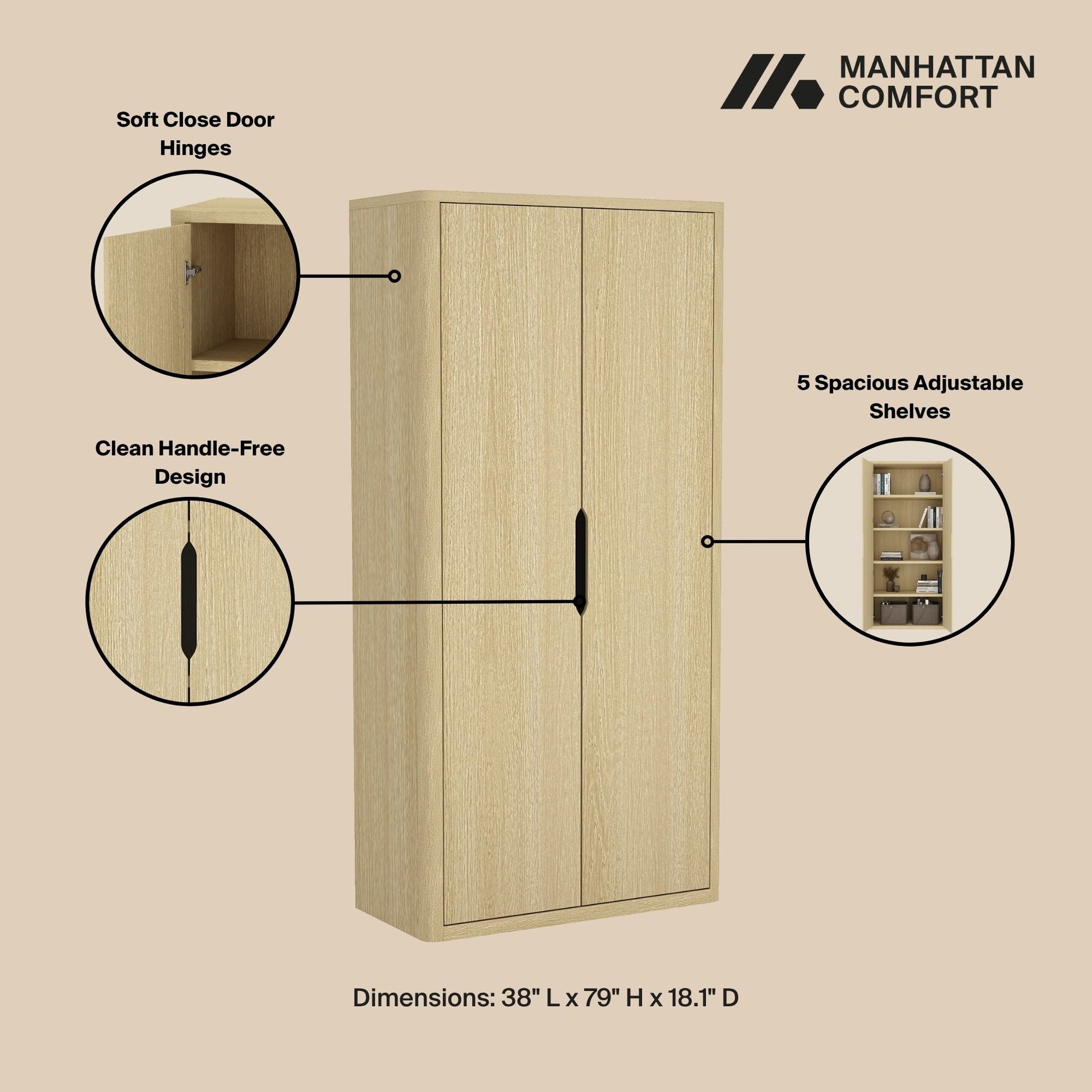 • Dimensions: 38" L × 79" H × 18.1" D.