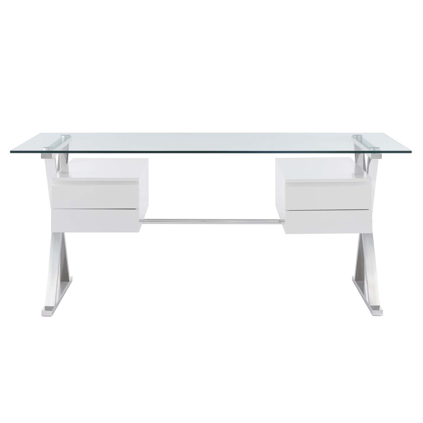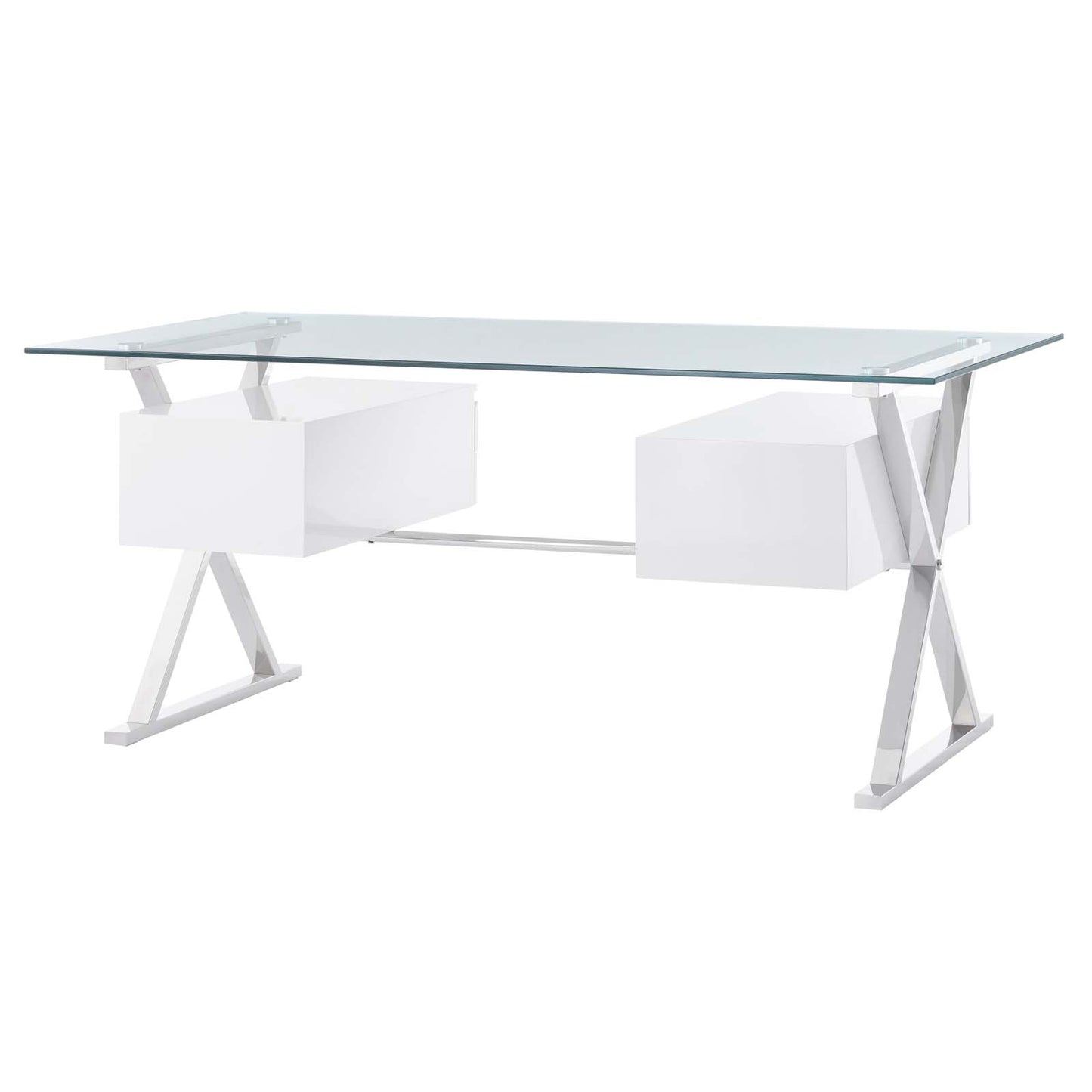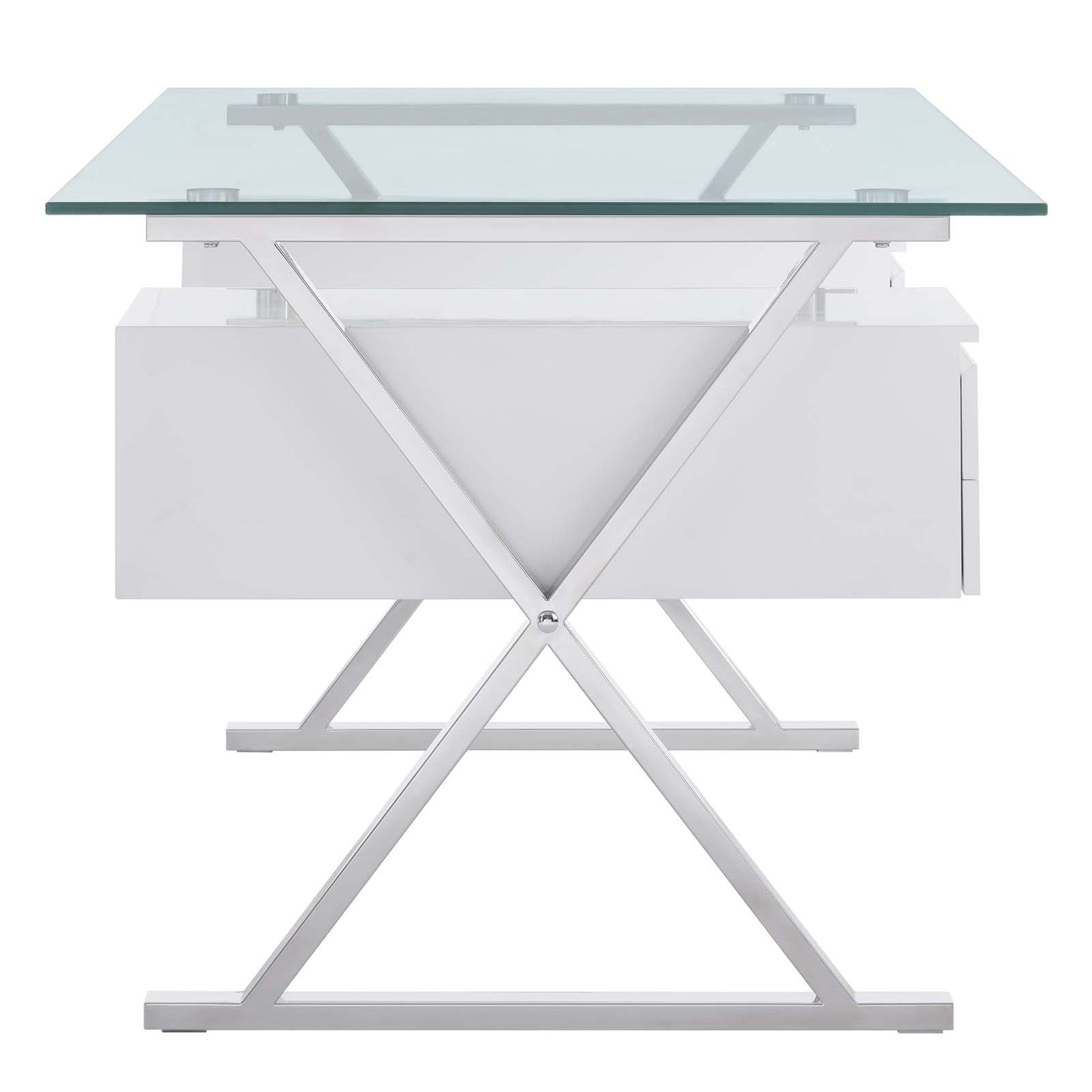 Create a space of distinction with the eye-catching, modern silhouette of the Sector Glass Top Office Desk. Resting on a polished stainless steel X frame, this computer desk is complete with a tempered glass tabletop and two sets of floating full-extension drawers that offer ample storage space for all your office essentials. Inspiring focus and productivity, this writing desk is ideal for the office, college dorm room, or any workspace. Includes non-marking foot pads to protect flooring. Assembly required. Weight Limit: 331 lbs.