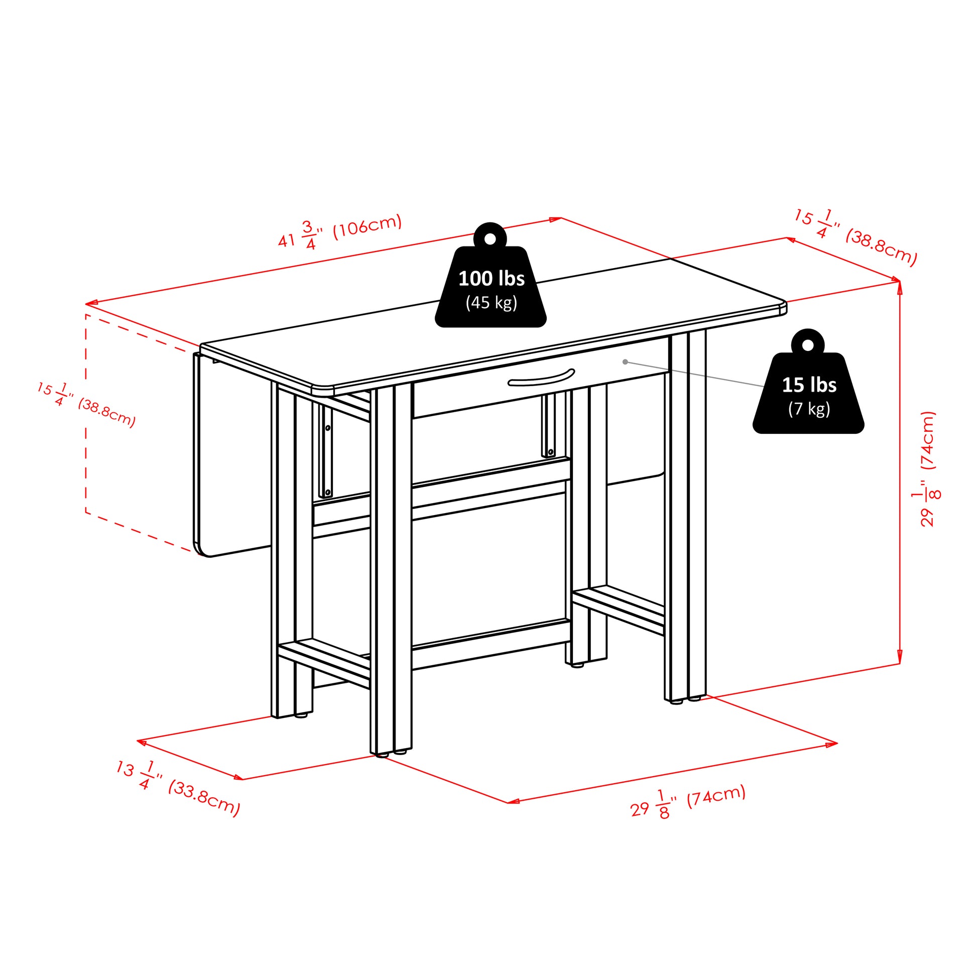 This 5-piece Taylor Drop Leaf Table Set features an elegantly simple and versatile table with four handsome solid wood folding chairs. With the drop leaf extended, the table is doubled in size and is perfect for dining in the kitchen or breakfast nook. Use the table as a console with the drop leaf down. Or make the set an ideal addition to the family room to spread out games or a puzzle. The table-wide drawer provides storage for silverware, placemats, games, or personal electronic devices. The table top and frame are made of solid wood for long lasting durability. Overall size with drop leaf extended 41.7"W x 30.5"D x 29"H.