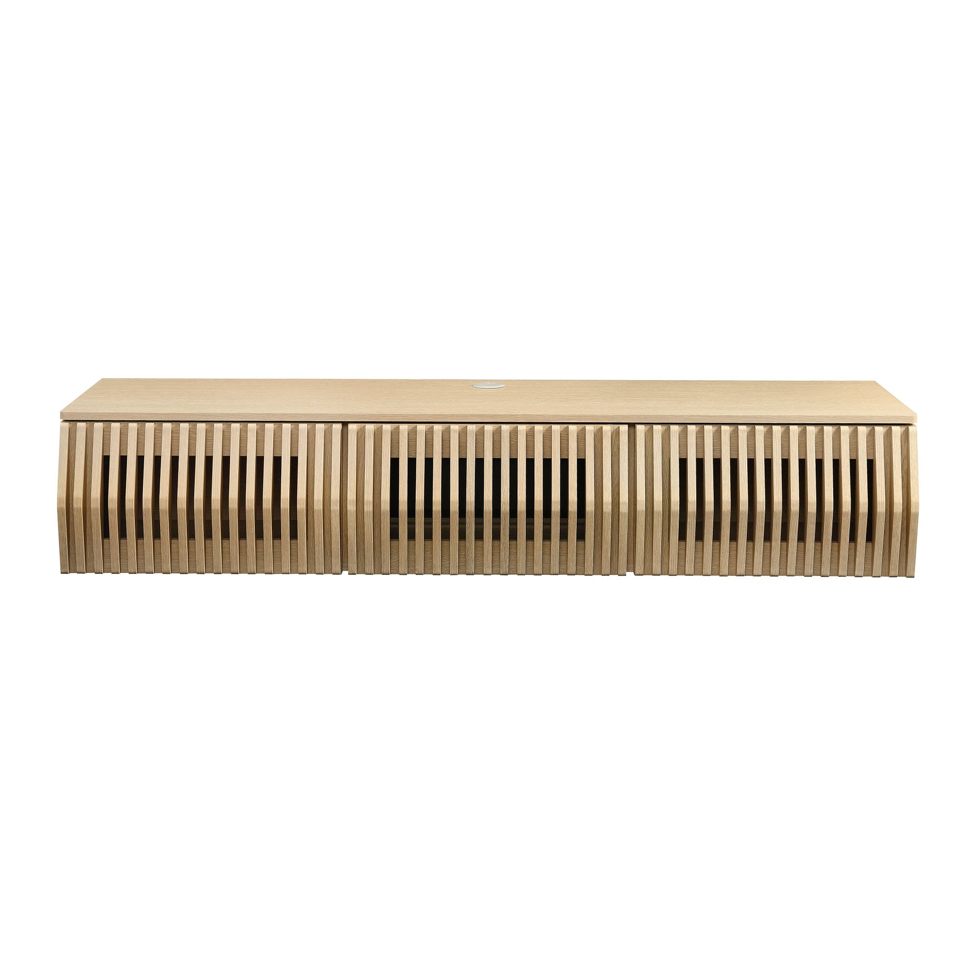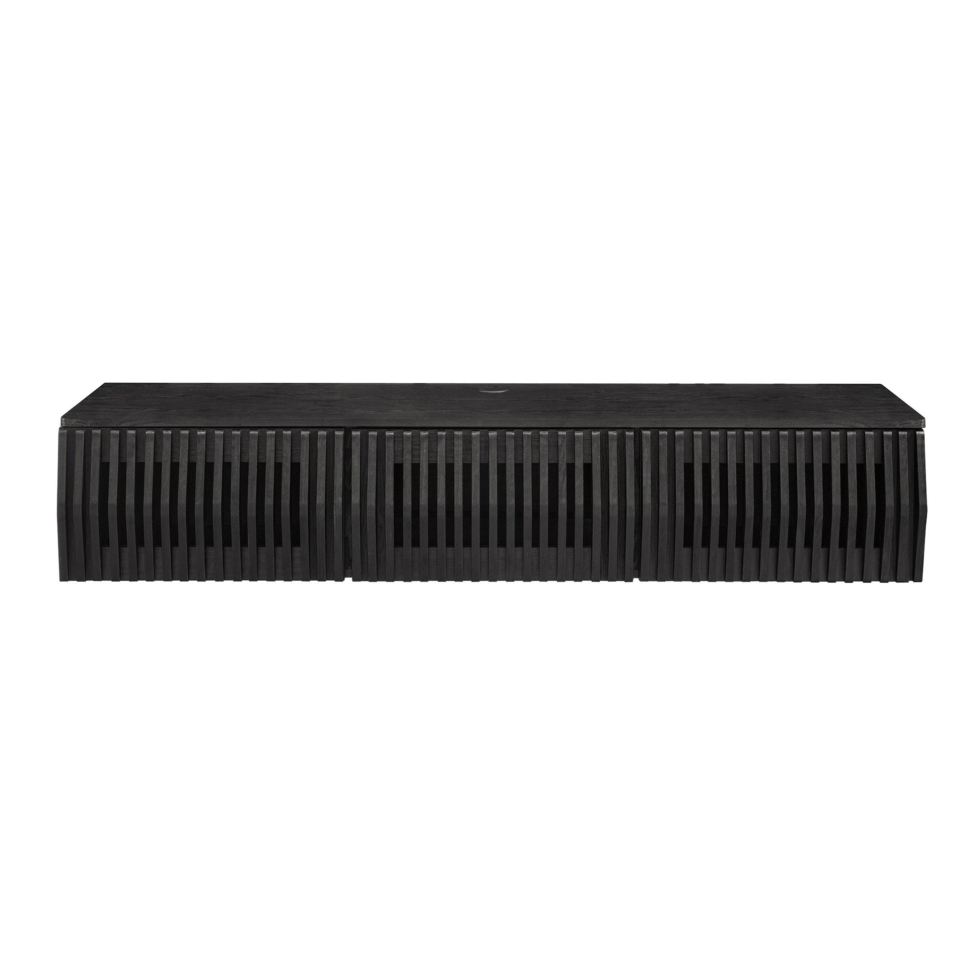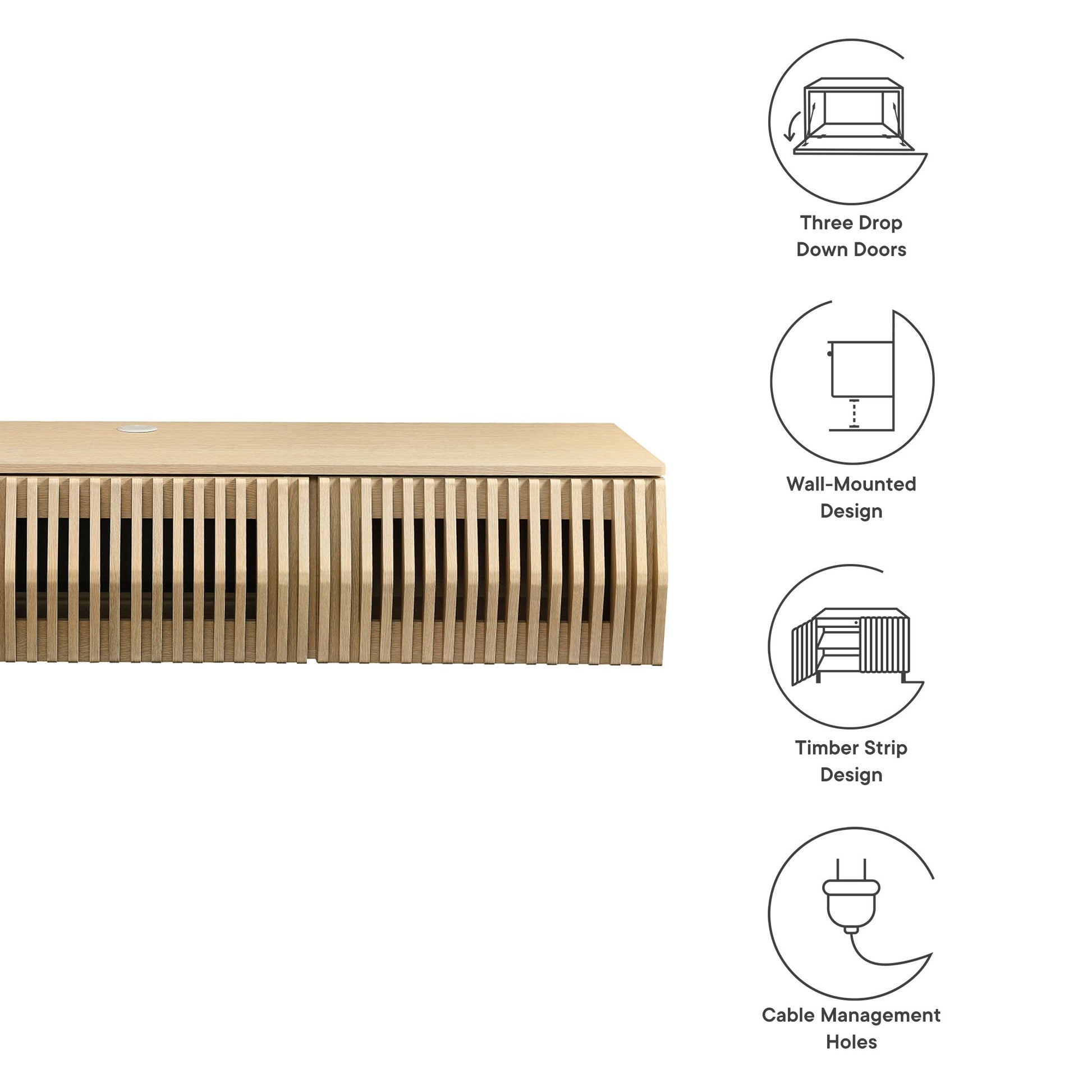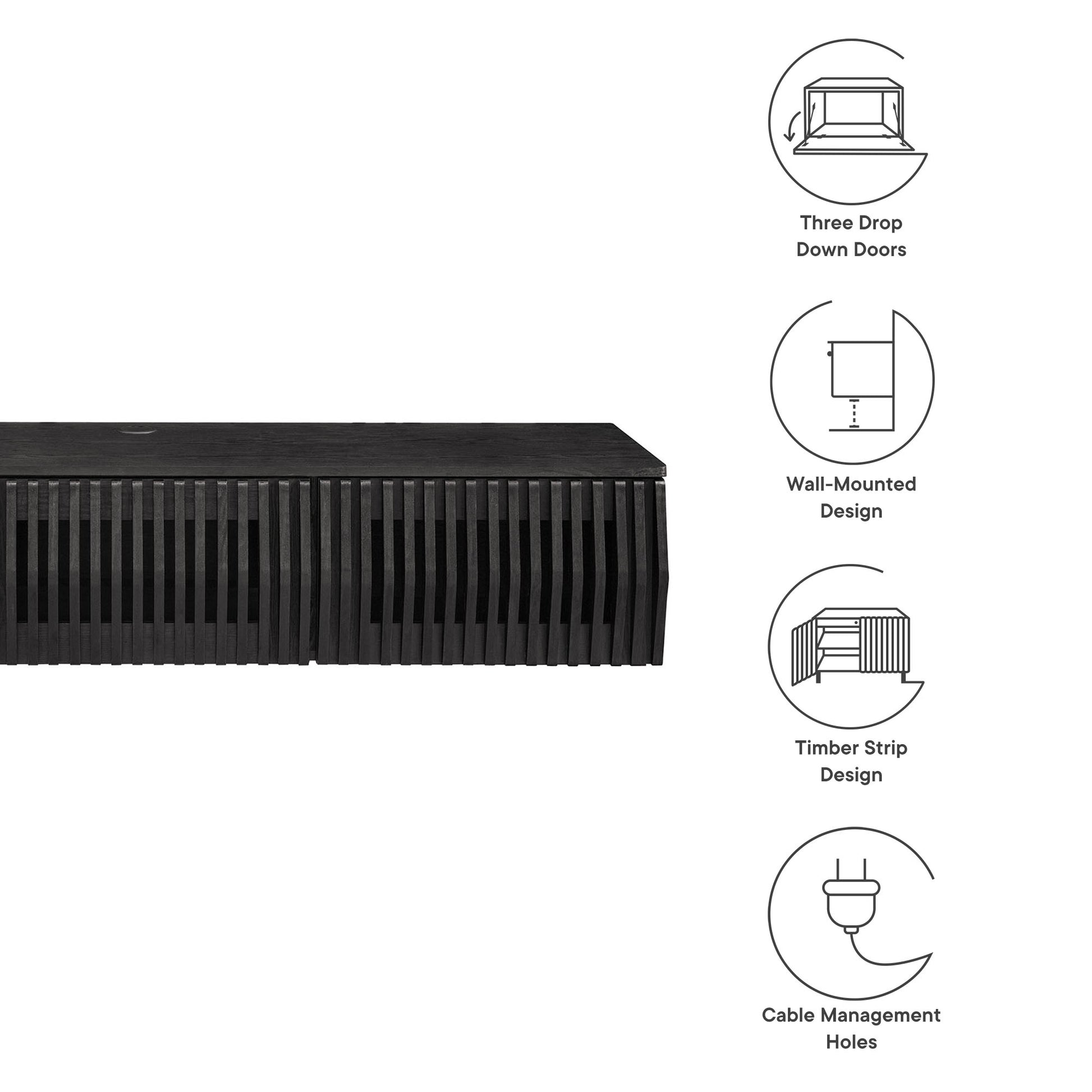Transform your living space with the minimalist and functional elegance of this wall-mounted TV stand. Crafted with a smooth laminate finish, this contemporary TV cabinet adds a sophisticated touch to any room. The vertical slatted design cleverly conceals three drop-down doors, providing ample concealed storage for all your media essentials and more. Perfect for modern living rooms or cozy recreation areas, this floating TV stand not only enhances your decor but also keeps your space organized.