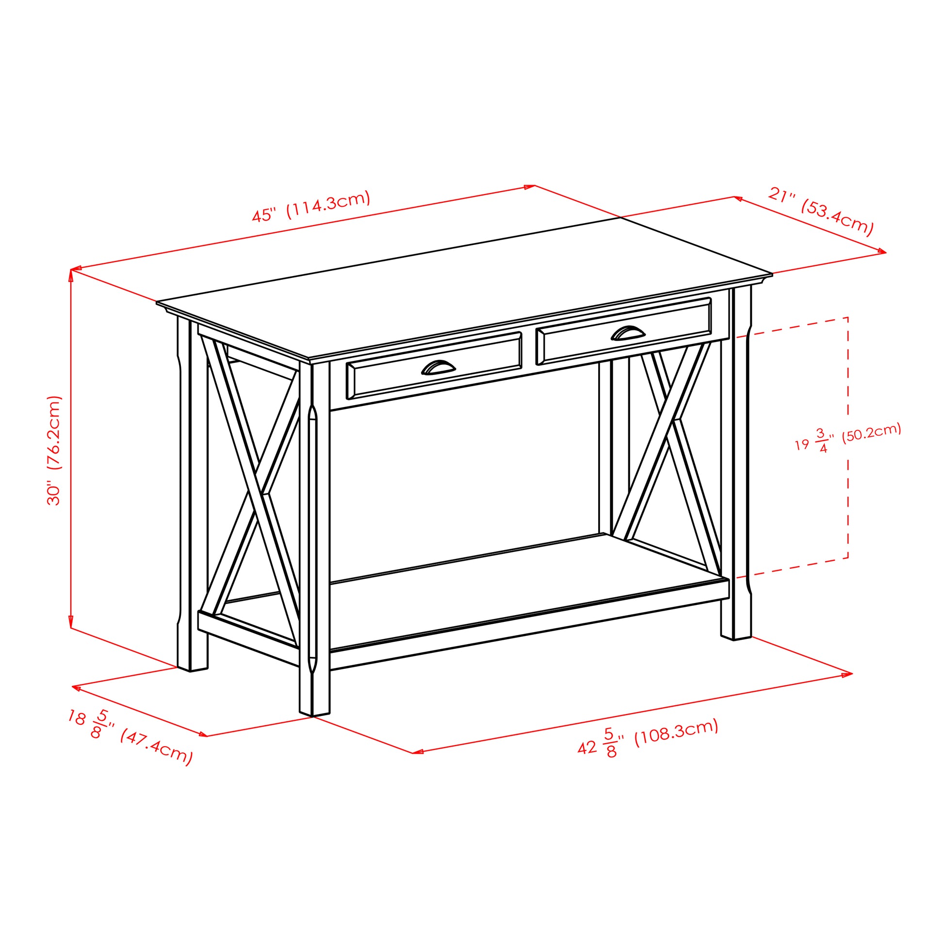Outfit your home with the style and multi-function of the Winsome Wood Xola Console Table. The Xola collection is named for its “X” cross design, pieced on each end, which adds a deeper artistic flavor and is accented by a rich cappuccino finish. This table features two functional drawers that provide that extra storage space and drawer pulls that are stylish in a brushed pewter finish. A unit-wide bottom open shelf ideal for displaying a beautiful tall vase or simply for storing books and magazines. Perfect table to complement your entryway, hallway or living room all while still conserving space. Constructed of solid and composite wood for long-lasting durability. Complete the look with other products from the Winsome Xola collection (sold separately). Conveniently packed and shipped in 1 box, that includes the hardware necessary for assembling. Replacement part request can be submitted directly to the manufacturer within 60 days from date of purchase. Dimensions : 45 in. Wide 21.02 in. Deep 30 in. High