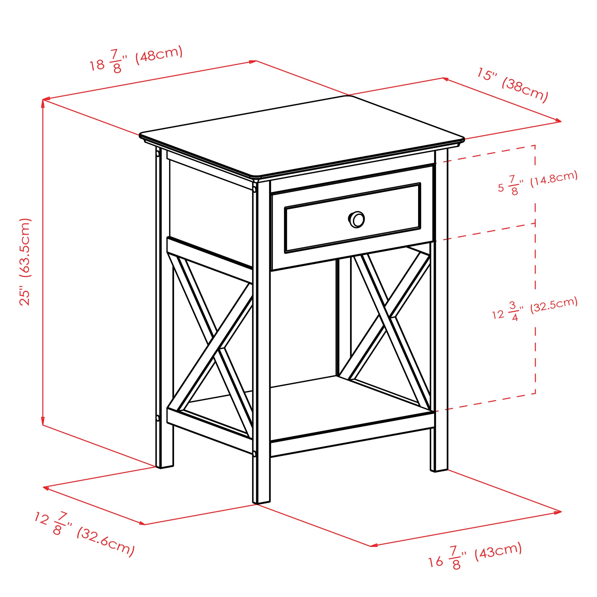 X-style side panels bring a contemporary look to the warmth of wood in the Winsome Wood Xylia Accent Table. This all-around end table will look great in the living room, as a bedside table, or as a printer stand and storage unit in your home office. The large drawer is finished with a brushed silver knob and will keep the TV remotes, an iPad, or charging wires within easy reach. A lower shelf is perfect for books, magazines, or for collectibles that will be open to view from three sides. Constructed of sturdy solid and composite wood in a rich coffee finish. For larger beds, sofas or rooms, try adding one accent table on each end to unify the space (each sold separately). Conveniently packed and shipped in 1 box that includes the hardware necessary for assembling. Replacement parts can be requested directly to the manufacturer within 60 days from date of purchase.